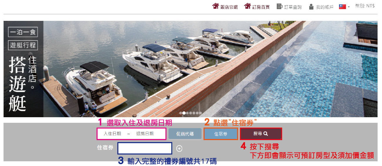 線上訂房僅開放券面具有面額之票券預訂,贈品券不適用
