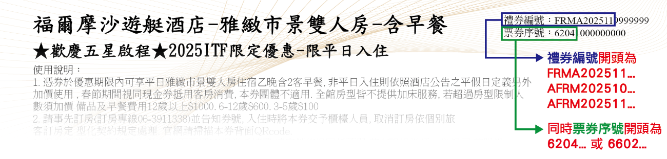 凡持有2025ITF台北國際旅展購買之住宿券,於線上訂房頁面輸入禮券編號,即可立即訂房