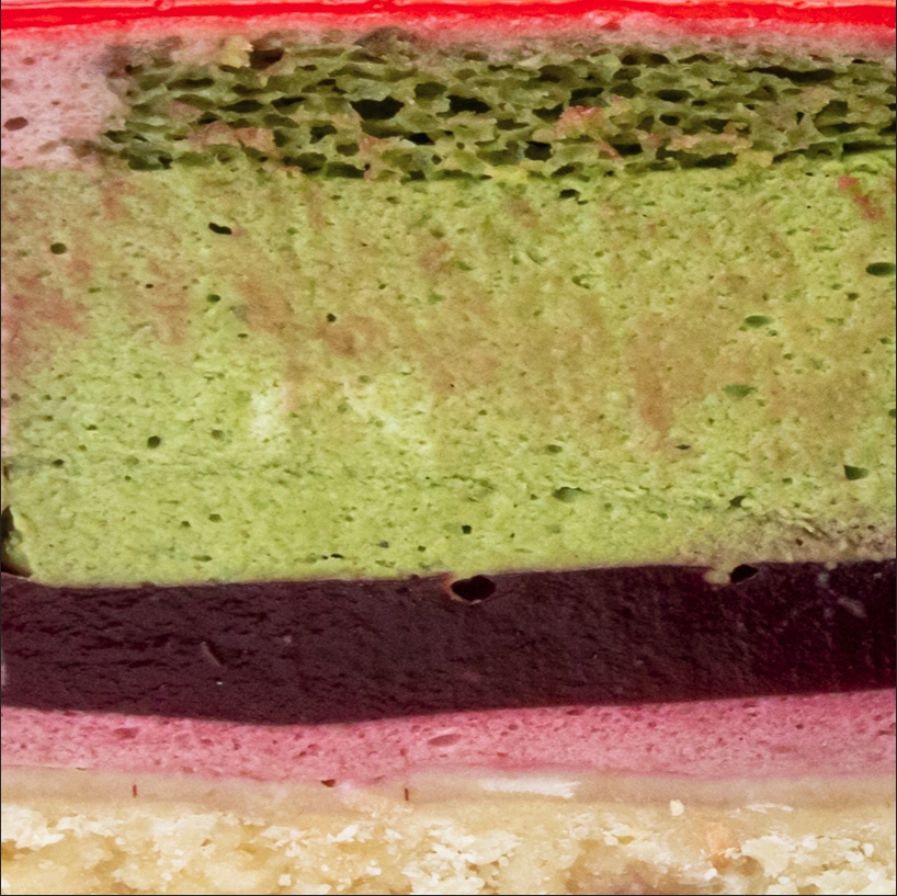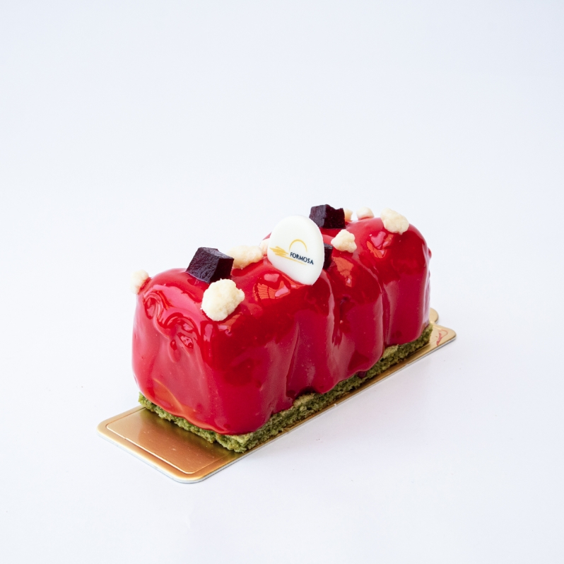 宛如紅寶石般奪目的鏡面外觀,輕輕切開,是令人驚豔的豐富層次。微酸清甜的覆盆子與甘醇深邃的抹茶完美交融,底部的雙重脆片更添驚喜。這是一件獻給味蕾的法式藝術品。